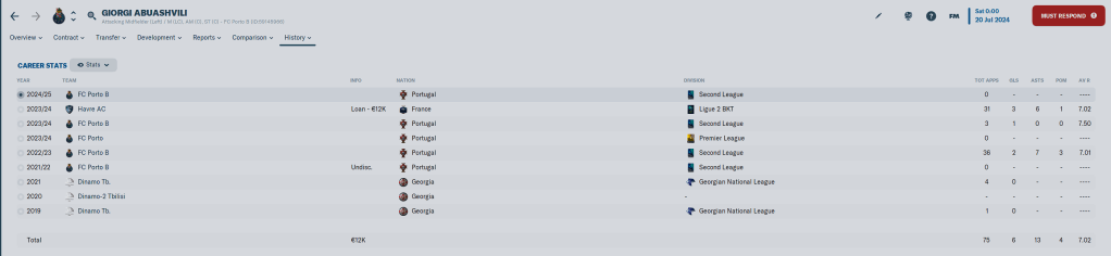 At Santa Clara, he would be very good, amongst the best players at the club. My Scout and my coaches say he’s 4 star current, 4 star potential player. His versatility makes him even more useful to me, and his wage is within my range as well. If Porto want me to cover 100% of his wage, I can. Last season he was on loan, at Le Havre: