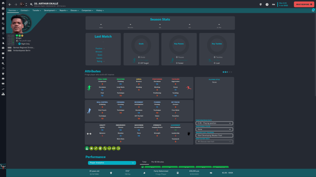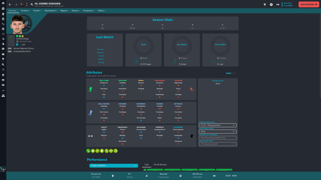 Christian Beck is the only pure forward we have on the squad, and he is very much your prototypical Target Man, and that’s the good news. The bad news is that he is 34 years old, and as he and the other attacking players go. so does squad. If he stays healthy, and if his attributes don’t start to fall off a cliff, I like our chances. That’s a lot of if’s though. On paper Euschen is our 2nd Forward, but I have other players with better numbers in the Requisite Attributes. His versatily does make him useful, but I don’t know how much he will contribute this season.