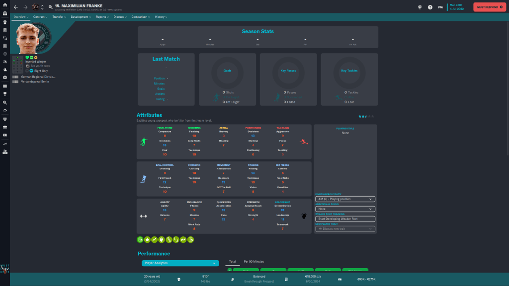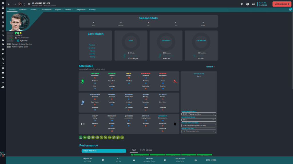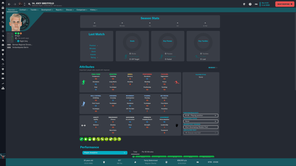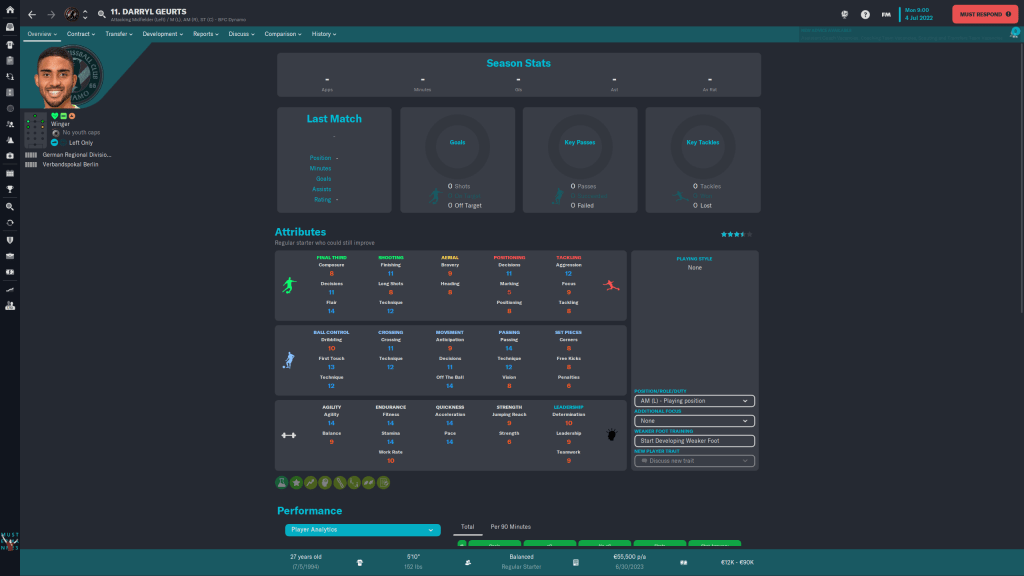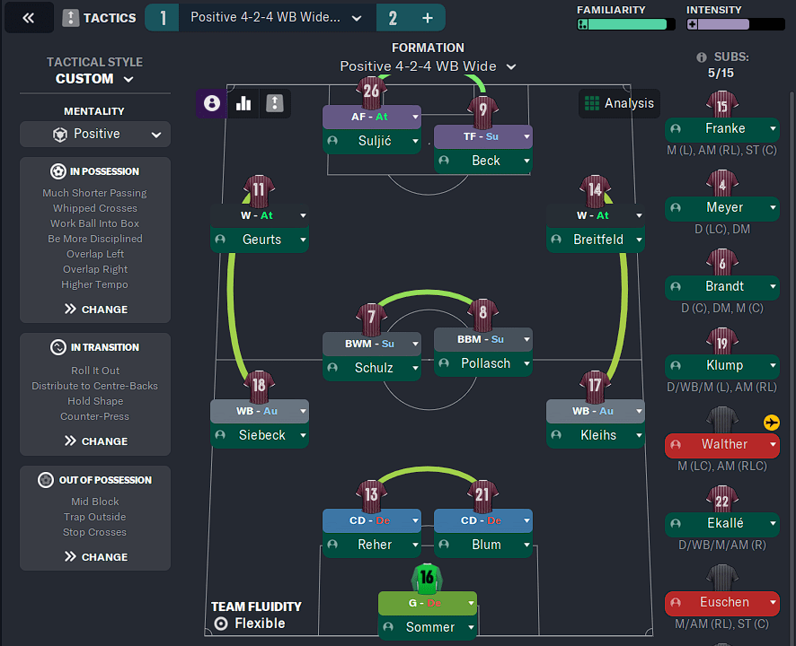 Geurts is probably the only natural Attacking midfielder we have on the squad, and that’s fine. Suljić is also a fine attacking mid, but he play the same position as Geurts, and seems to be better suited to playing forward. Advanced Midfielder is going to be one of those positions that is going to see some rotation probably, as neither Franke, who comes in on loan, or Walther are good enough (yet) to be starters. But I do have players capable of playing attacking mid.