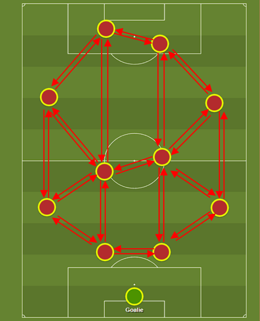 It also means out two midfielders are the pivots, which means the passing should break down like this: