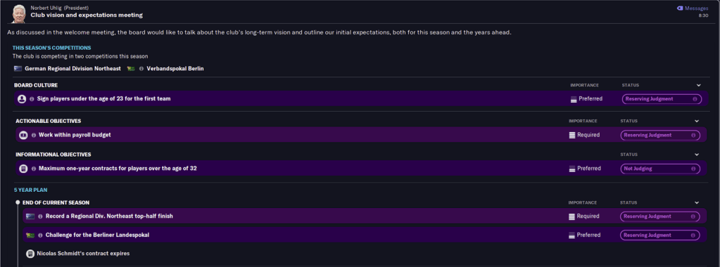 “Ownership wants the team to get promoted. To Bundesliga 2, in seven years. I told them I could do it in five if they backed me up in certain things, player moves, contracts, things like that. In return for those considerations I promised I would not interview with any other clubs while Coach here, no matter where we are in the standings and who comes asking.”