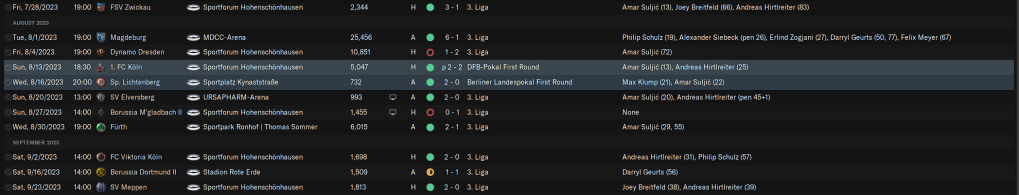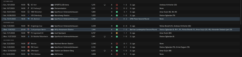 We won 2 and drew 1, and I thought we were doing well, but back to back losses against Verl and Freiburg were frustrating. Suljić announced his return from injury with a hat trciks worth of goals against TSV 1860 München, and I thought the formation was working, why mess with a good thing? Oldenburg was a match we dominated in almost every statistical category, but it took a 79th minute goal to win. Bochum was in the Relegation Zone when we played them in the Pokal, but they had more than enough to send us out of the tournament, mostly because injuries and fatigue forced me to play a squad that wasn’t my strongest up top.