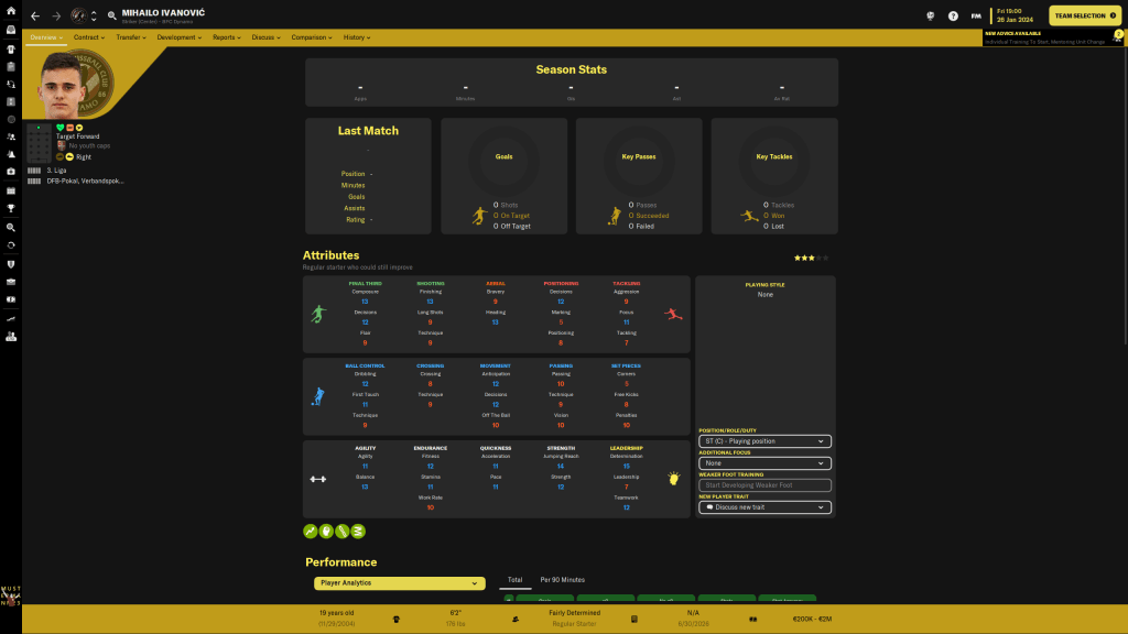 Mihailo Ivanović didn’t cost me anything. I promised Vojvodina he could have all the first team playing time he wanted, and they said “Sure.” But to be honest until he agreed to come I was a bit wary of it ever happening. He doesn’t have any real weaknesses in his attributes, and at only 19 years old I suspect by the times he’s 23 he will be quite a bit better in some area’s, but for the level of football we are playing at right now, he’s at least as good as most of the strikers we will be facing, and that’s all I can ask for.