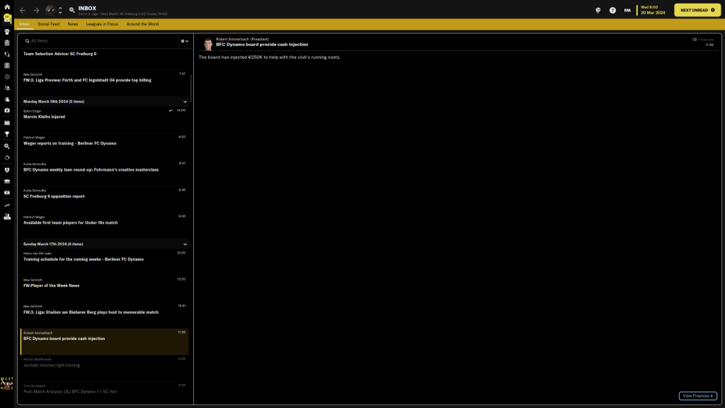 I’d like to think if we hadn’t gone a man down against BMG II in the 32 minute, we would have held them to a draw, which is what we did against the BVB II squad about 4 weeks later. The one piece of not so great news was that Suljić twisted his ankle badly right before the FC Viktoria Köln game, he was going to be out a minimum of 4-6 weeks, which meant Hirtlreiter was my primary striker for the time being. I wasn’t to enamored with my depth at Advanced Midfielder to mover either Geurts or Ogbaidze up, in fact the first few times I played Ogbaidze he didn’t exactly light the world on fire. So I dropped to a 4-3-3 system because it was the next best formation I could put a player in and have them do a respectable to good job.