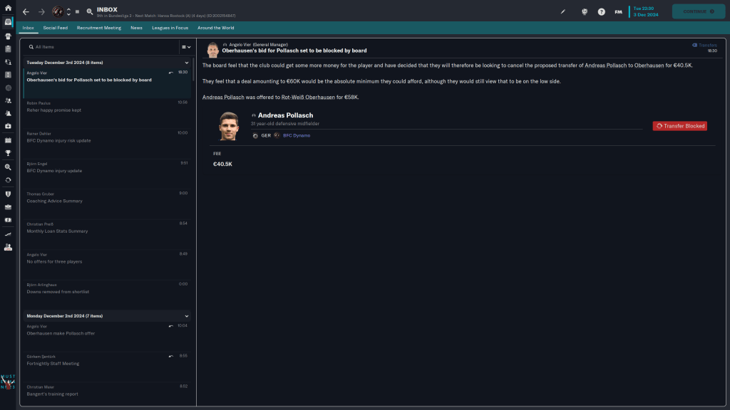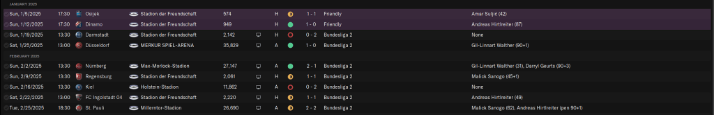 Somehow, we held off Administration. By the skin of our teeth, by bribing someone at the DFL to look the other way, I am not sure. But it took three rounds going back and forth with the board to get Pollasch moved to Oberhausen, until finally they relented and let him leave. That took care of most of our payroll issues, Bangert and Brandy going on loan with Luneberg and Viktoria Koln covering most of their salaries helped as well.