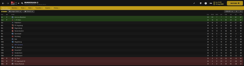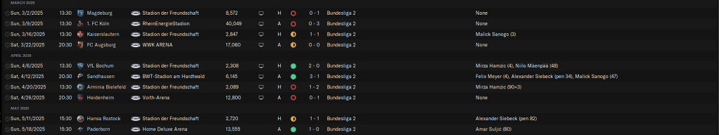 We lucked out with Bochum and Sandhausen. Bochum was just behind us in the table, and Sandhausen was just outside the relegation zone, and both teams were lackluster at best. Winning both of those games meant we were staying up, the draw at Hansa was a bit disappointing because they were in last place, and beating a former DFV team.