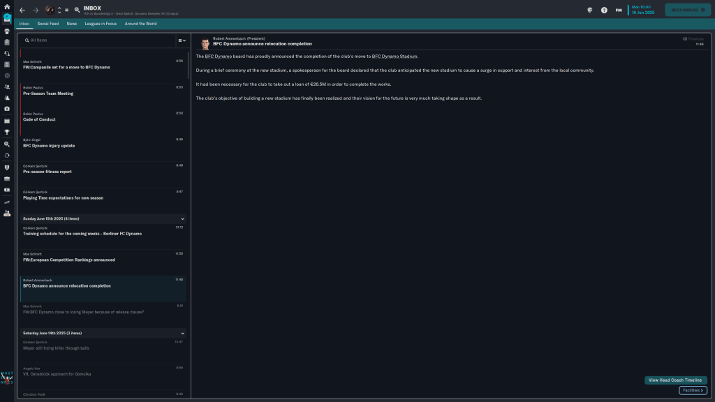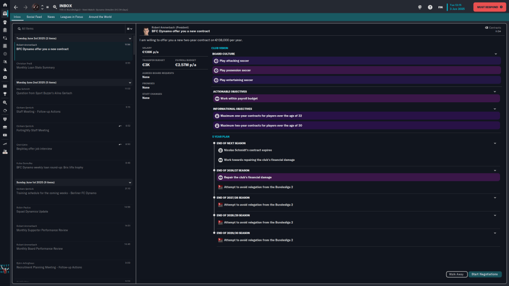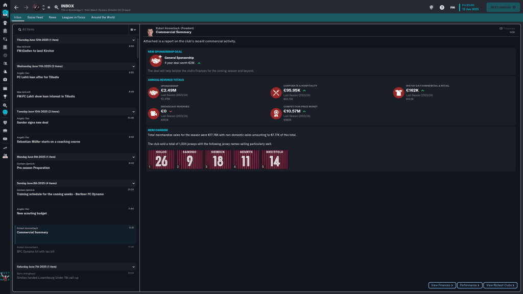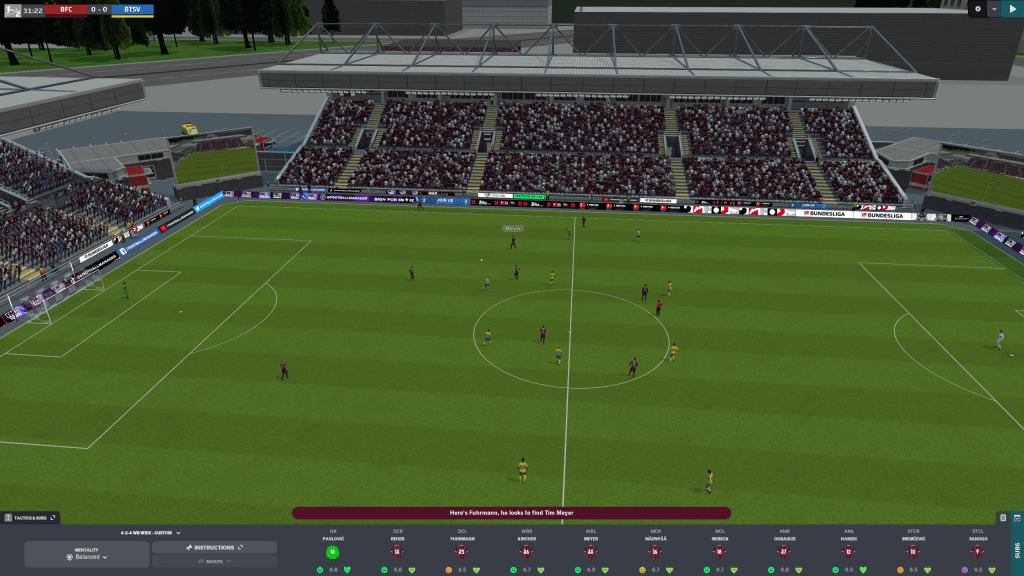 We did manage do convince Union Berlin to let us keep Sanogo another season, but the club itself is in a precarious state. We have some younger players with a great deal of potential: Hamzic, Fuhrmann, Mehri and Ott; and several older players who if they get hurt, or leave, we cannot replace all to easily. At 32 Siebeck is still the best WB(L) I have, and if he goes down I may as well look for a new formation to run. Kircher is adequate on the WB(R) side, but he isn’t getting any younger, or better.