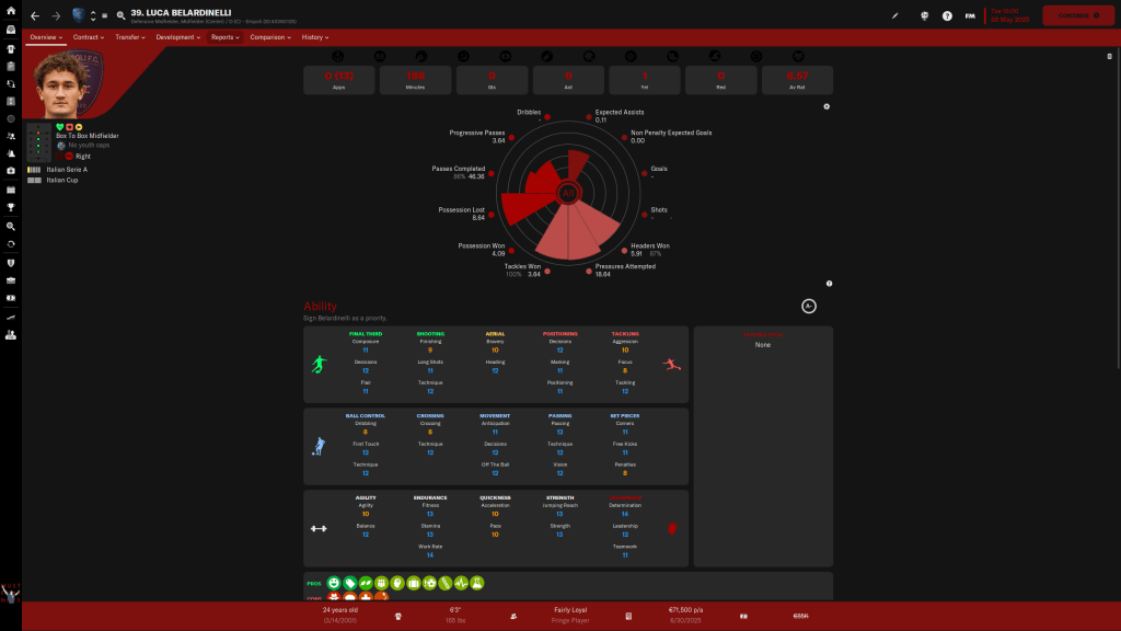 There’s always one player you don’t think you are going to get. He’s wanted by bigger teams, your club may not be in the best place, and while their salaries demands aren’t onerous, you are always shocked when they do agree to sign for you/ This year, Luca Belardinelli is that player. The former Empoli player didn’t see the field all that often, but on paper he is easily the best midfielder we have, above average in almost every category without having any real weaknesses in his game. He is a strong Bundesliga 2 player, and getting him in on a free at €71.5K a year is a great deal.