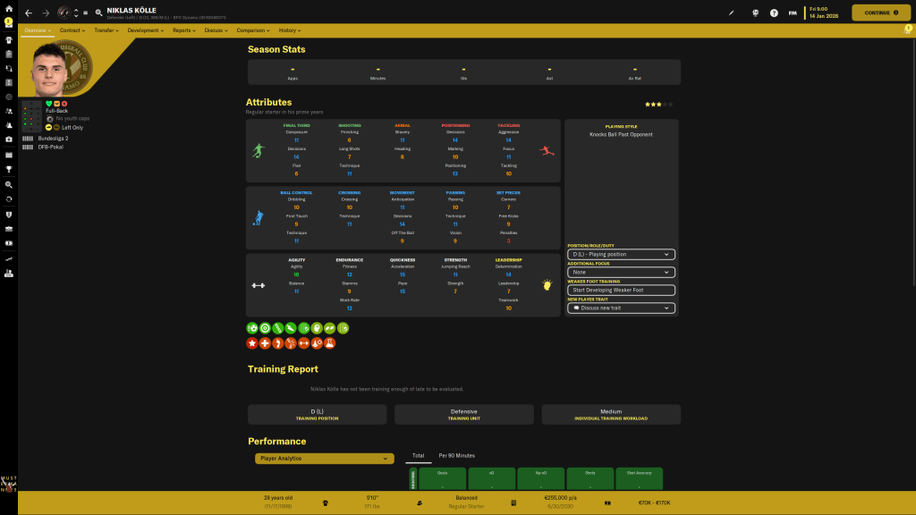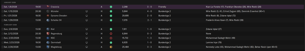 2028 has gotten off to a decent start for us. Transfer wise the window was quiet. Despite some scouting and some offers, the only person to sign for us in the January transfer window was Niklas Kölle. I’m taking a bit of a flyer on him, he’s a ‘Jack of All Trades, Master of None’ type of player who loves big matches but is injury prone, and he’s a bit older as well. He’s going to compete for a starting position, I just don’t know which one yet. He’s had some solid seasons at MSV Duisburg and Hoffenheim II, but last season at Sønderjysk in Denmark he didn’t do so well, but he’s here on a free, and if he contributes, I’ll be happy. On the outs, noone of consequence left.