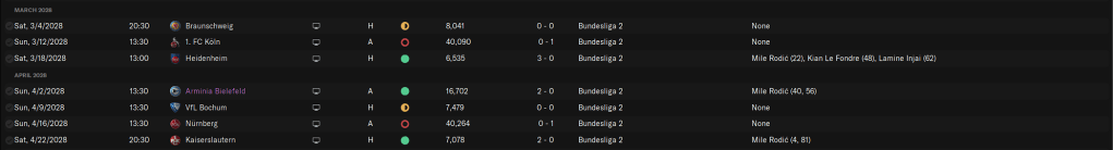 The 1-0 loss at Koln may look bad, but they are running away with the league this year, and are going to be promoted, so holding them to 1 is a good thing. Rodic had a 6.1 this match, so of course he scores at Heidenheim, and then a brace at Armenia Bielefeld. We’re neck and neck with Bochum in the standings, so a draw is nearly as good as a win, and like the 1-0 loss to Koln earlier, losing to 2nd place Nurnberg by the same amount isn’t too bad either. Kaiserslautern is fighting relegation as well, they’ll need a lot of help to stay up as well, but of course Rodic scored another brace.