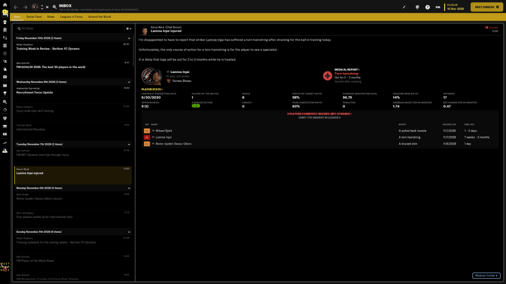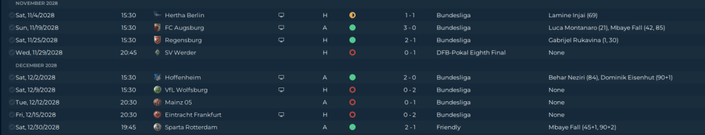 We had a good run to finish October and into November, but Injai going down really hurt us more than I expected, because I had high hoped for the likes of Rodic and Eisenhunt, but it’s clear to me now that Eisenhunt doesn’t have the skills to be a full time Bundesliga player, and Rodic doesn’t have the mentality. If I could combine them together I’d have a pretty good player, but I can’t.