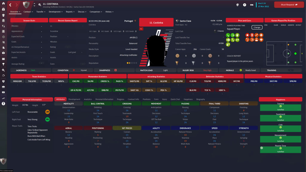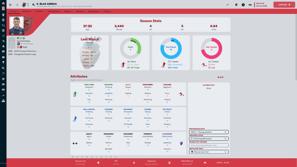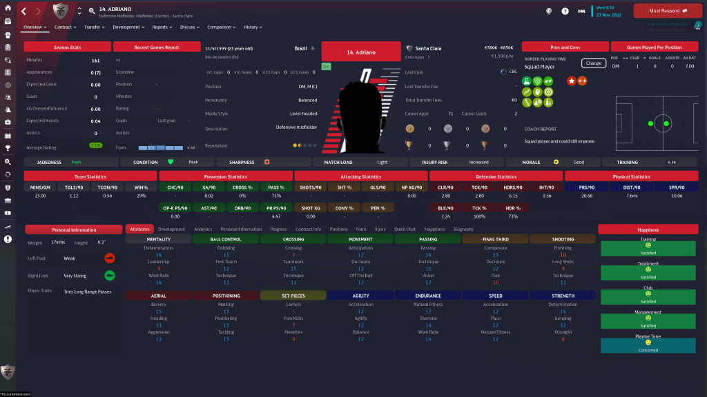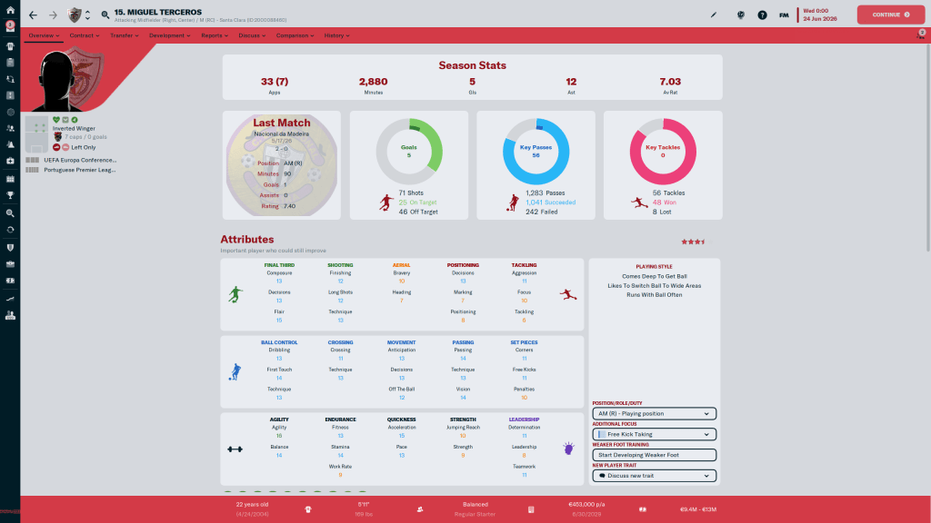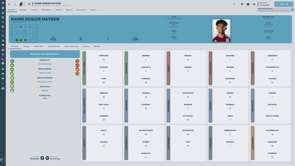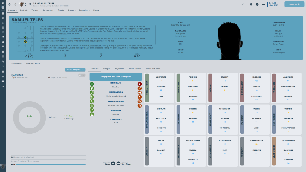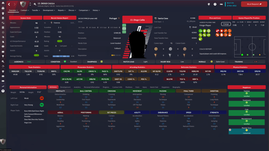 Diogo Calila is currently listed and wanted, but I am going to take him off the transfer list. This year the formations I am using tend to have wingbacks in them, and Calila is a solid wingback. At 24 y/o, the 3 start current, 3 star potential ability player has few weaknesses in his attributes, but nothing really stands out either.