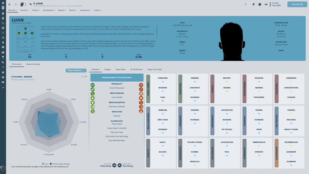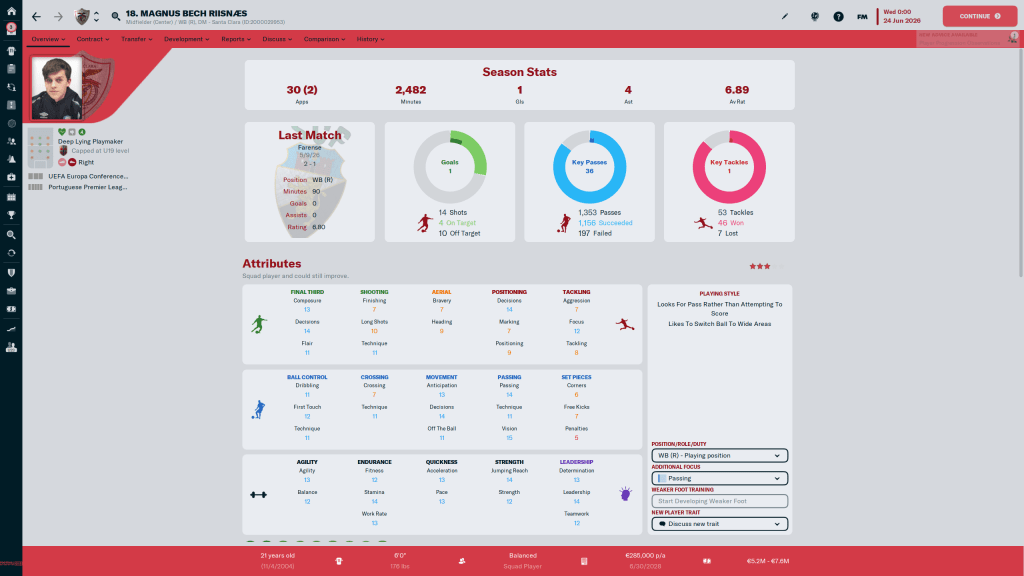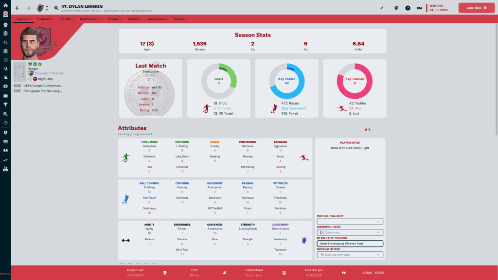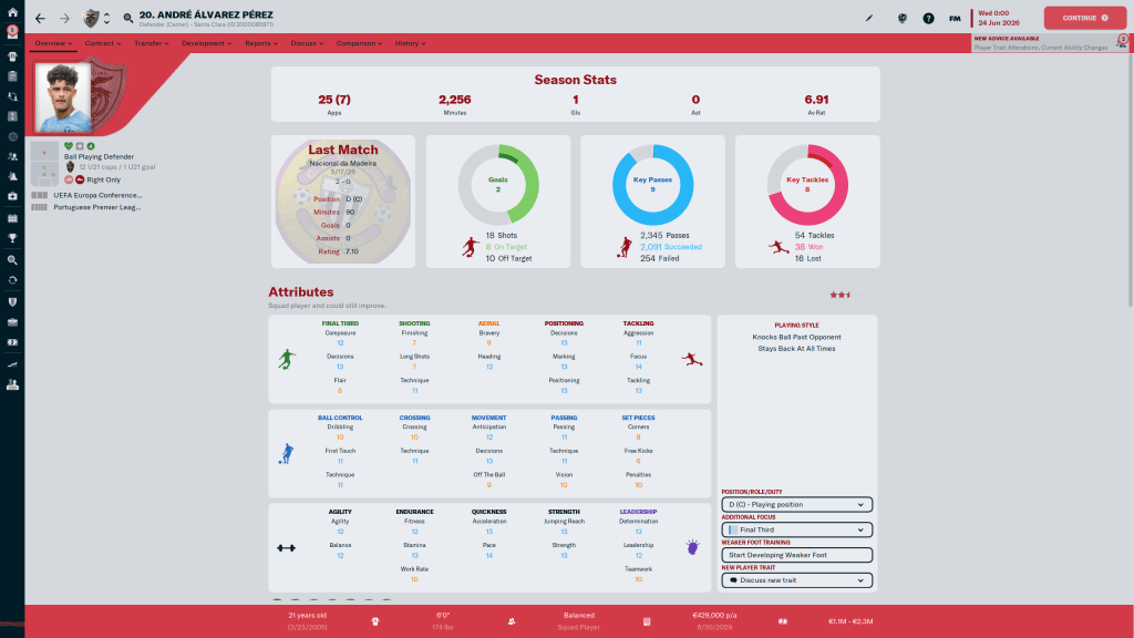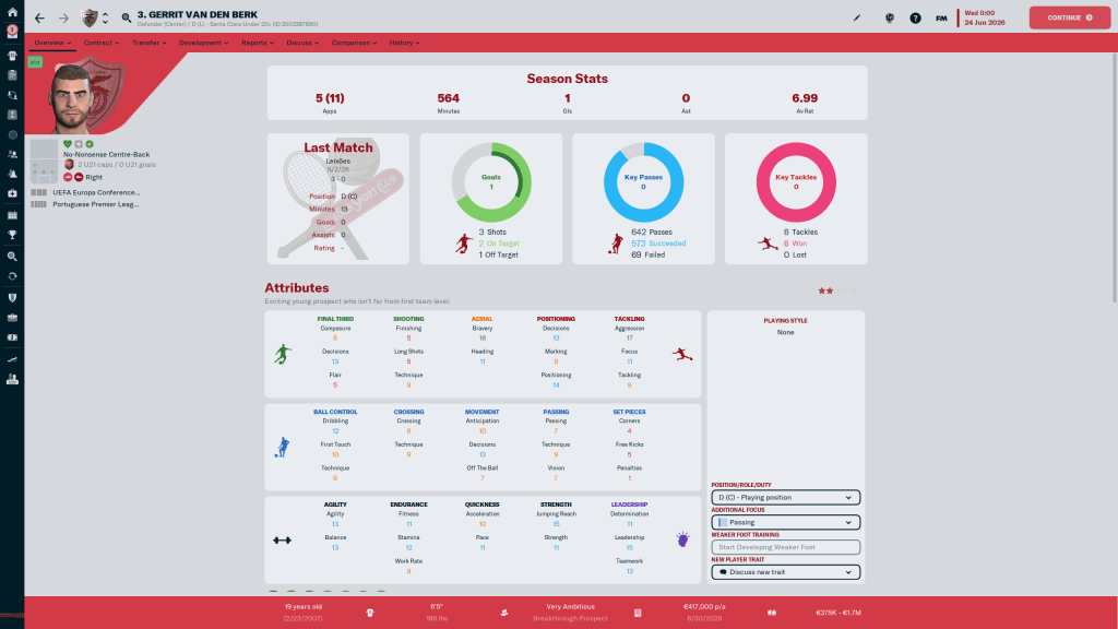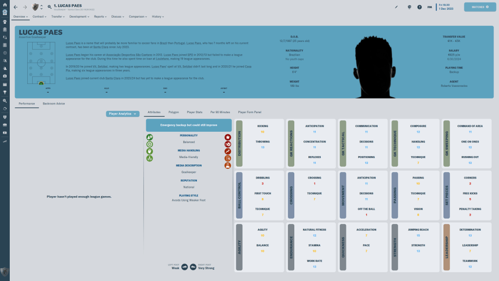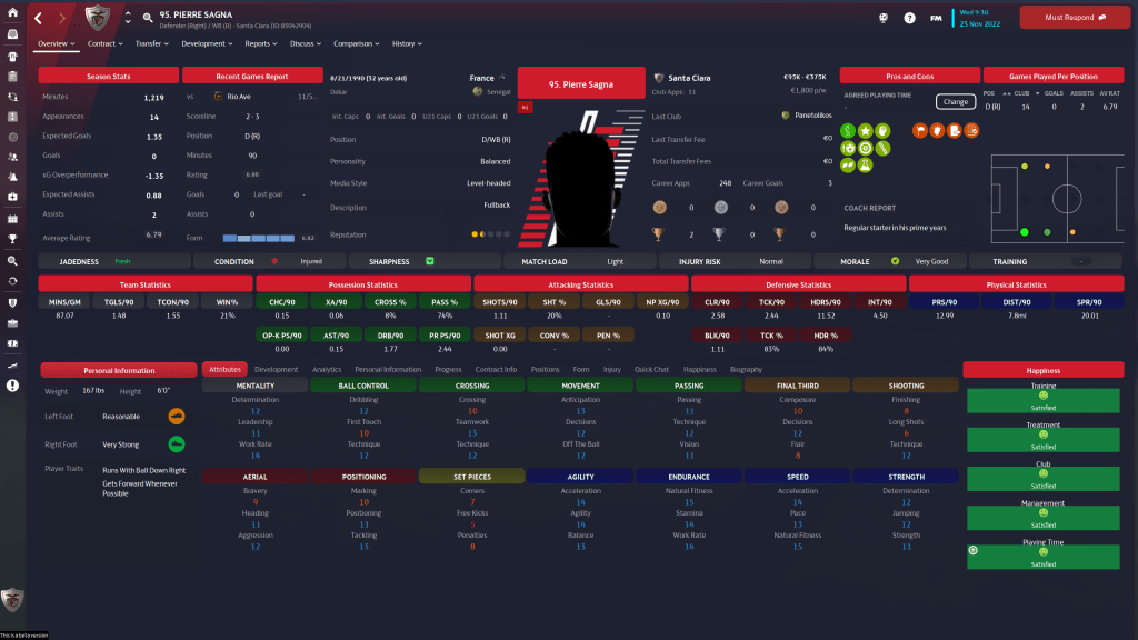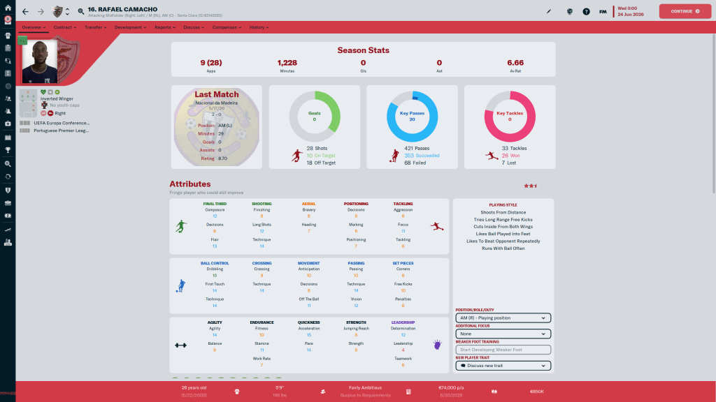 Diogo Calila is currently listed and wanted, but I am going to take him off the transfer list. This year the formations I am using tend to have wingbacks in them, and Calila is a solid wingback. At 24 y/o, the 3 start current, 3 star potential ability player has few weaknesses in his attributes, but nothing really stands out either.
