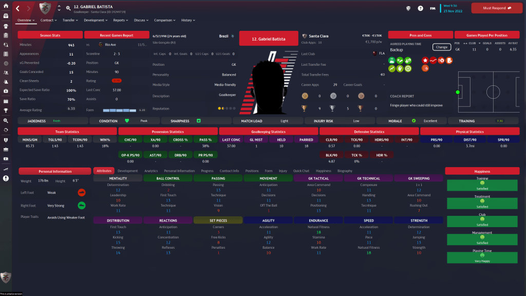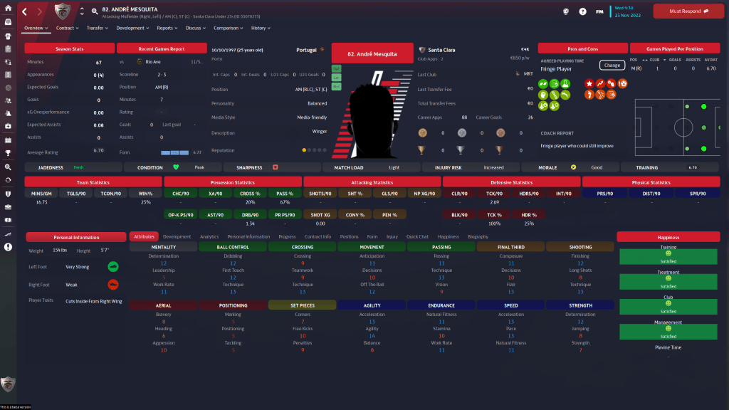André Mesquita is a versatile player, and that’s about the only thing he has going for him really. 2 star current and 2 1/2 star potential ability means the 25 y/o has most likely reached his developmental limit, and he is lacking in to many areas for me to find a place for him on the squad. If he is still part of Os Açoreanos when the transfer window closes, I’ll be surprised.