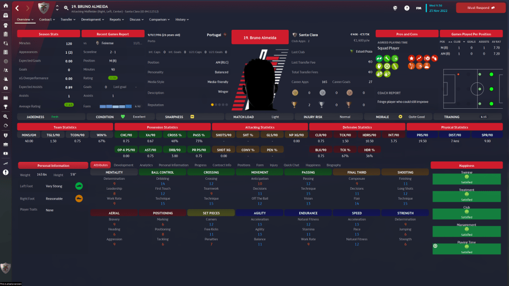 Bruno Jordão is also in Santa Clara on loan from Wolves. At 24 y/o, the 3 1/2 star current, 4 star potential player has been solid off the bench for Santa Clara, and I suspect that is a role he will continue to have going forward, given his positional versatility. The only thing that does worry me is his injury proneness, but I find if you start worrying about that too much, thats when they get hurt.