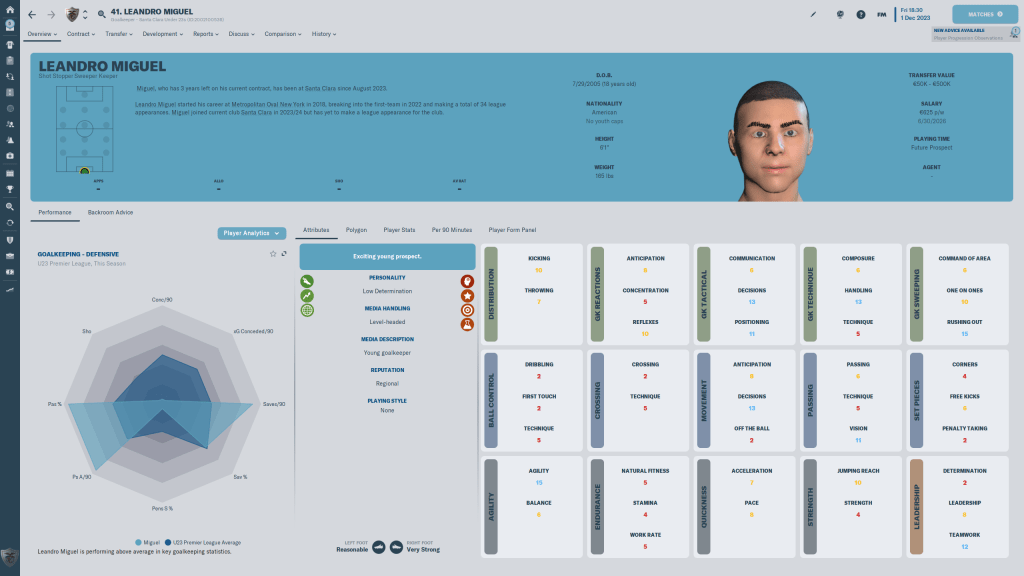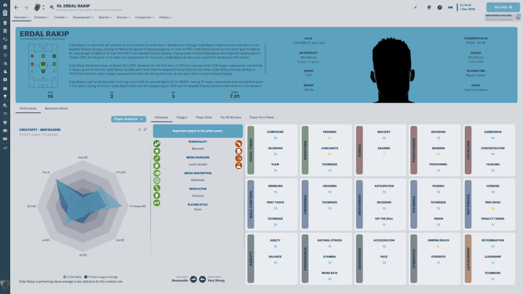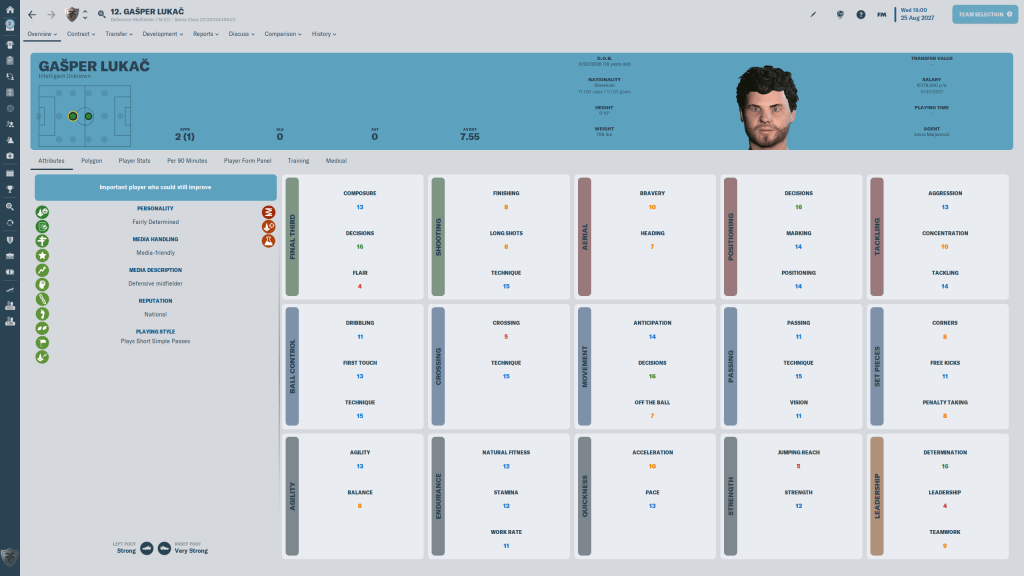 I could talk about Gašper Lukač for ages. How I just happened to glance up at a screenflow result from an U19 international comp and saw his pass % completion was head and shoulders above everyone else, how my first look at him showed me a 19 year old player whose minimum number in six attribute categories was 13, how when I fully scouted him I about fell out of my chair, and how when Gorica said they only wanted 1M for him I did fall out of my chair, and kept saving the game every five minutes until he was actually here. I don’t know how long I can keep him, but while he’s here I am expecting great things from the kid. And those of you who have read https://fmjellico.com/2022/12/06/verjemi-mi-brat-to-imam/ will know those expectations have been met.