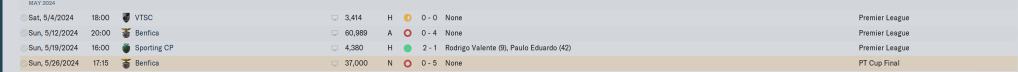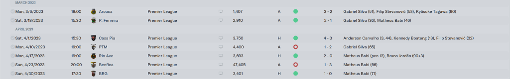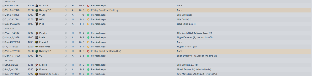 We did get lucky in some of these games. the Ilic goal against Maritomo was nice, as was the Marcos brace against Farense. We came back to draw Braga, which on paper looks like an accomplishment, except they were having an offseason and finished mid table. I didn’t realize we were still in the Cup until I saw the Semi Final Second Leg announcement and we thumped Torreense, meaning we were going to face Benfica in the final. Drawing Gil Vicente clinched us European football, we could do no worse than 5th in the League, but the last month of the season was the proverbial ‘Bridge to Far’.