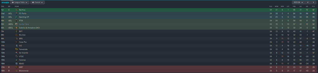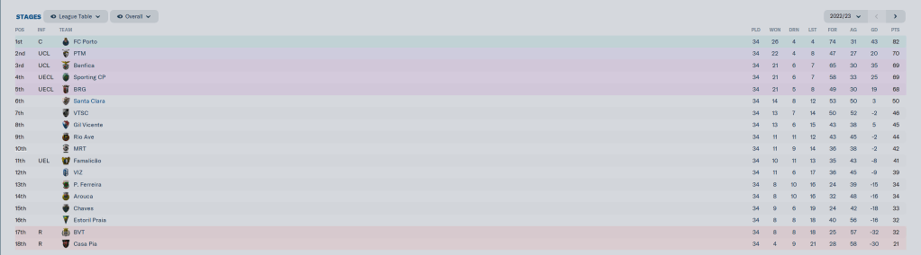 Then we crapped the bed. Boavista, who were in a relegation battle, shut us out 3-0. We beat Estoril, 2-1, ensuring their relegation battle with Boavista would continue, but a Victor Carvalho goal gave Gil Vicente the 1-0 victory. Against Chaves we had nothing to lose, 6th place was our spot, and with a 1-0 draw we waited for 5th Place Braga to beat 11th Place Famalicao in the Portuguese Cup, therefore pushing a Euro Conference spot to us in 6th place, and instead they lost 2-0, and we lost out on European football, with a final record of 14-8-12, with 53 goals for and 50 goals against, on 50 points, only 32 behind League Champs Porto.