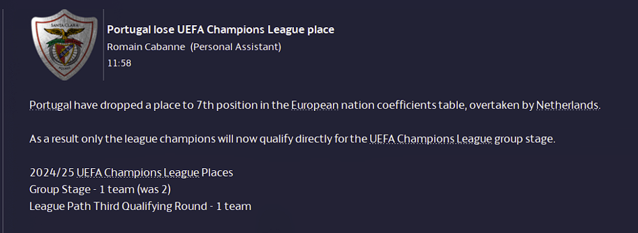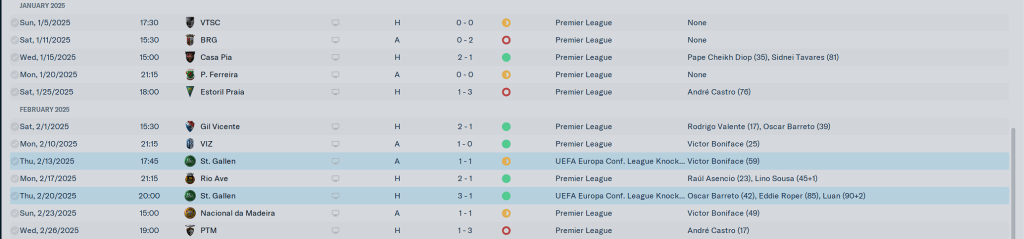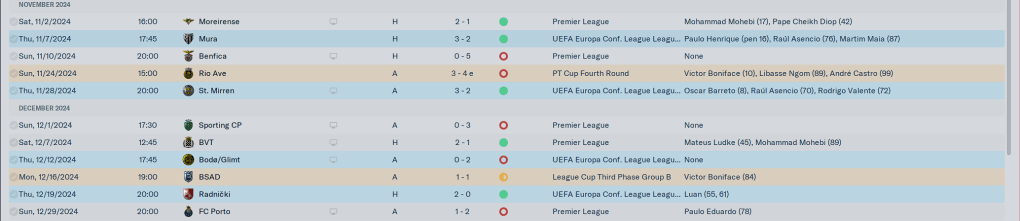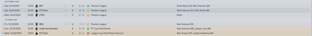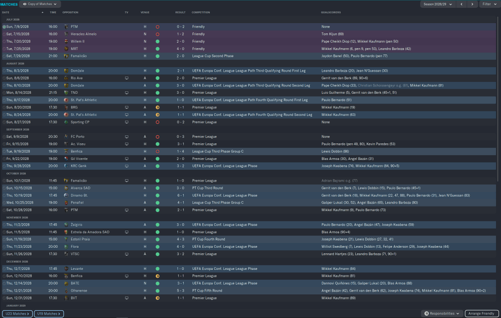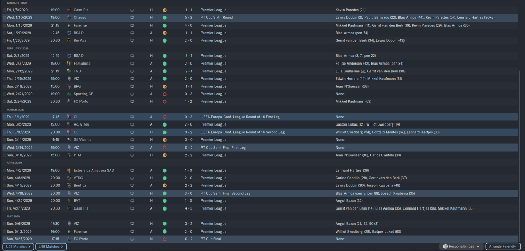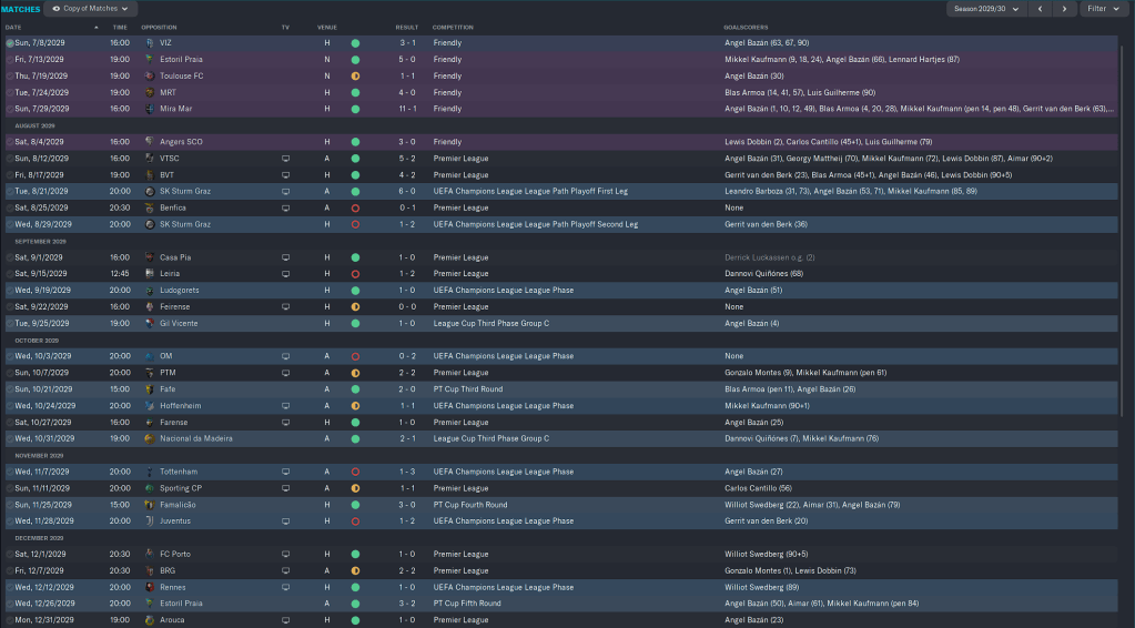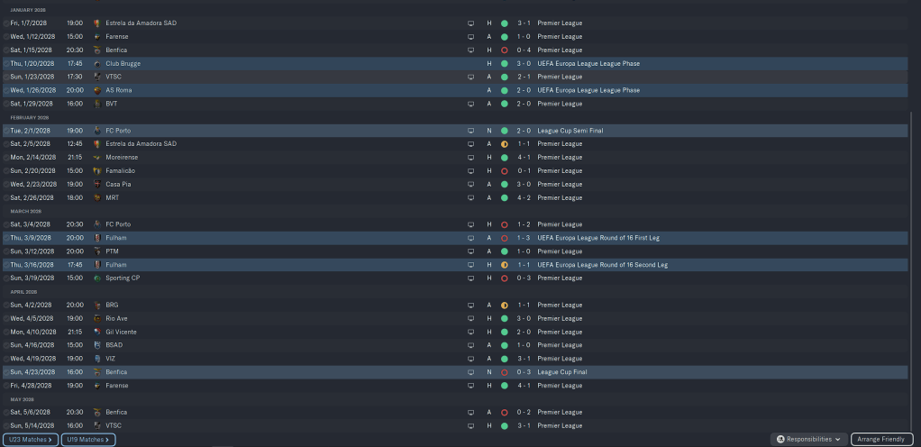 Our European group was very tough, but beating AEK, Rosenborg, and CSKA Sofia while drawing with Nantes and FC Rapid saw us go thru to the latter stages. Domestically we were beating the teams we were supposed to be beating for the most part, but losses the Belenenses and Casa Pia were bothersome.