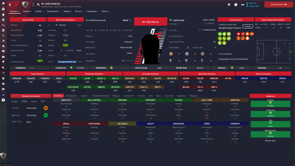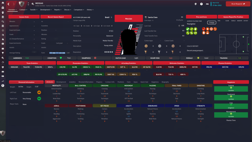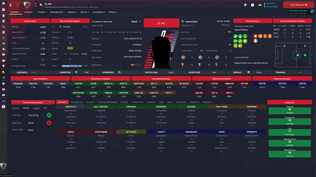 MT is a 21 y/o Brazilian on loan from Vasco de Gama, and at 3 star current 4 1/2 star potential, his positional versatility (He plays a very good M(C) and Striker) would make him a great asset to the squad. We do have a 700K optional future fee on him, but I don’t see us being in a place financially at the end of the season to exercise that option, which means we need to get what we can out of him this year.