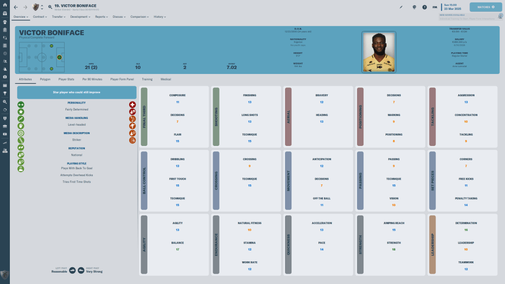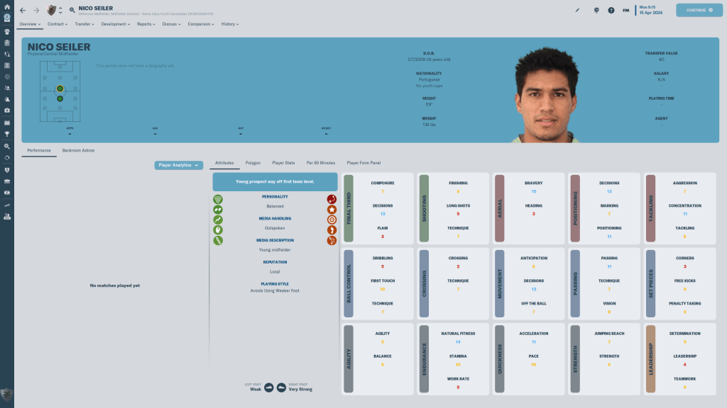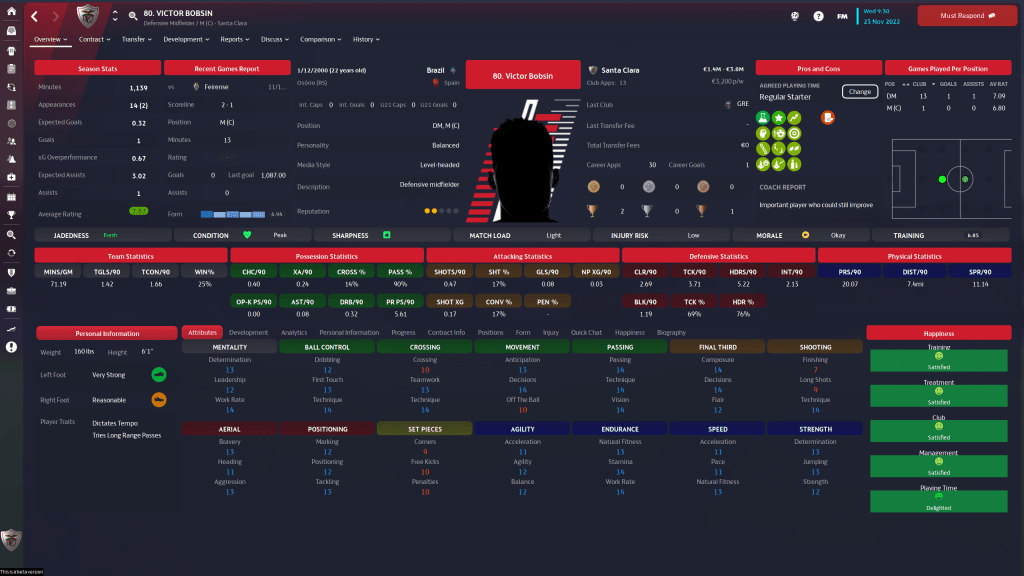 Victor Bobsin is a 22 y/o Brazilian who could be a stalwart for the club for years to come, if other clubs don’t notice how well he is doing and come to snap him up first. the 4 star current, 4 1/2 star potential has no real weaknesses from an attribute point of view, a 7 FIN being his lowest number, and his Work Rate, Passing, Technique and First Touch make him an ideal facilitator, the pivot from defense to offense. If he does as well as I think he can, it could be a problem holding onto him.