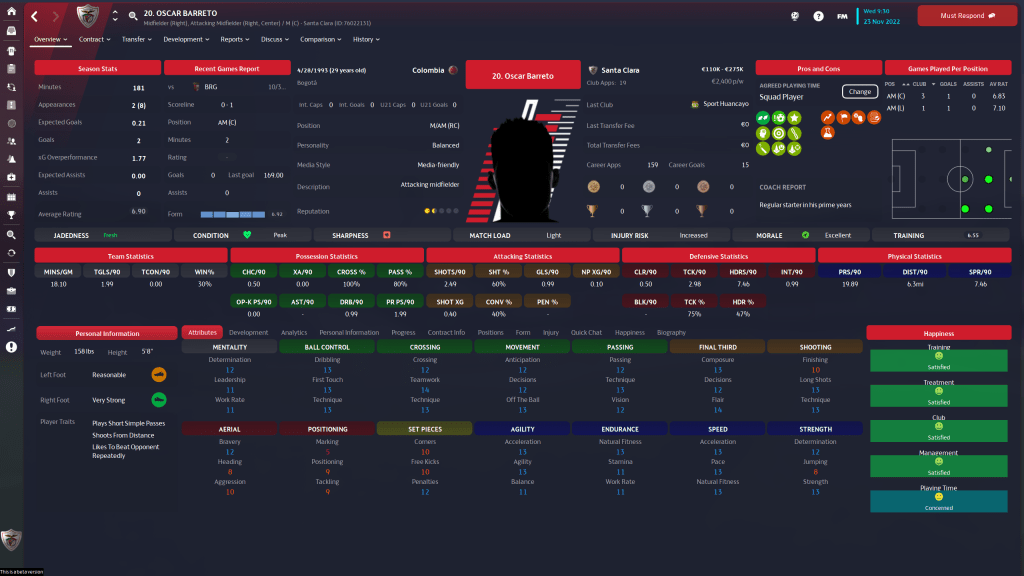 Oscar Barreto is more accomplished at M(R) and the Attacking midfield positions, but he will be a backup for the M(C)’s and AM’s more often than not. The 29 y/o is 3 star current and potential ability, is solid physically, mentally, and the skill specific technical attributes are good as well. Maybe not the start he was back in the day at Millonarios and La Equidad, but he is a capable, versatile bench player, and you can never have enough of those.