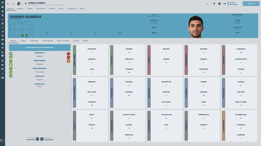 Gabriel Silva would prefer to be an AM(C), but my formation utilizes Inside Forwards. His strong right foot, good speed, pace, technique and off the ball, augmented by his very good flair and better than average Dribbling, finishing and first touch make this 20 y/o a key bench player and starter, while his positional versatility is also a plus. Also on loan from Palmerias, the 3 star current, 4 1/2 star potential youngster could be a very good player in a few years time, hopefully for us.