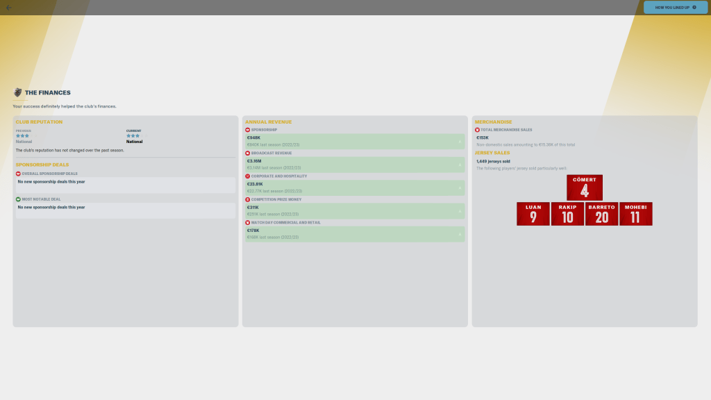 Player wise Ibrahim Machorro, my young Mexican International I wanted to be a back up, he started most of the games for us and did very well. But consecutive top 6 finishes in the Premier League and a deep run in European football did two things for us: Put us on the Map, and put us on the Map.