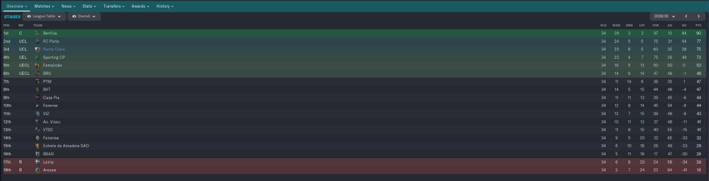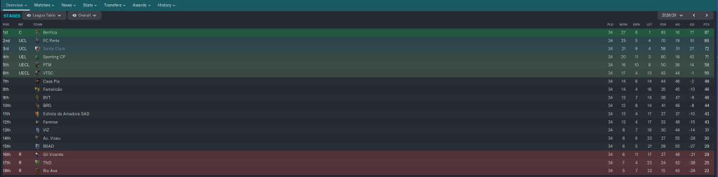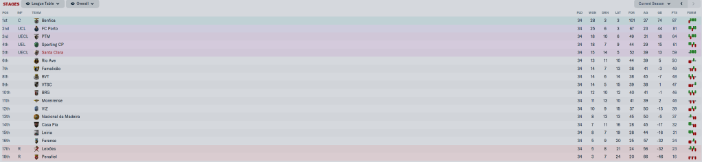 The draw against Vitoria made our job that much harder, and while the win at Sporting was nice, they had a solid lock on 3rd place and played a rotated side against us, so I am not counting it as beating Sporting. Benfica hammered us to clinch 2nd, and then two weeks later hammered us again to win the Cup. But we finished in 5th Place, European Football! And I am quite happy with that.