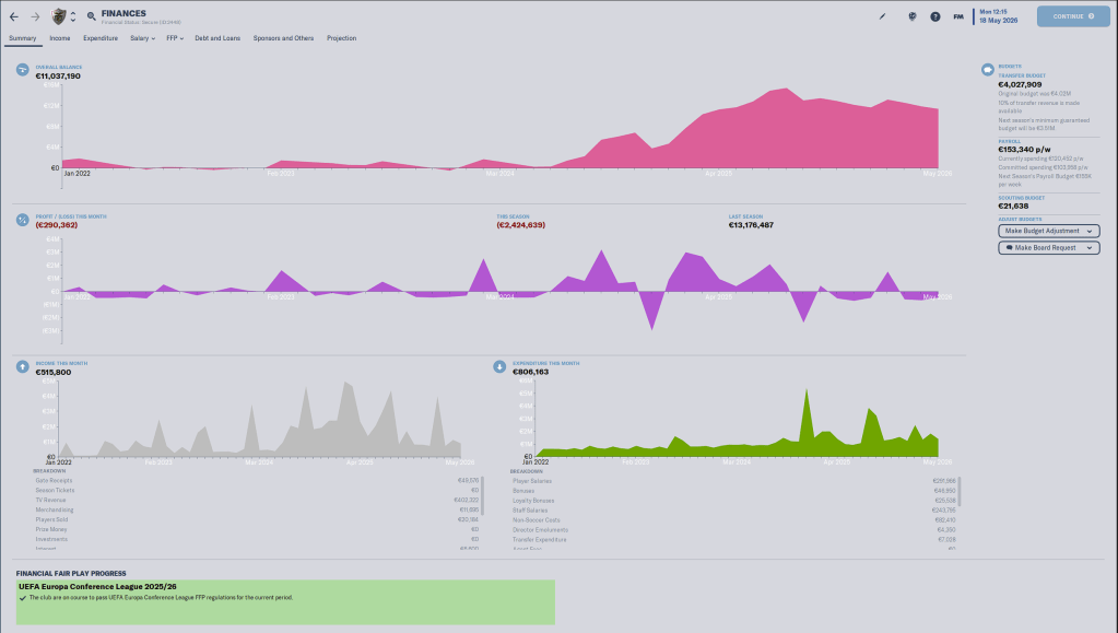 While for the moment the club is in the black, financially speaking they are Insecure, and more importantly are currently overspending on their wage budget by about 15K Euros. The club is paying off a 5M Euro loan, it will drop off the books in 2025.
