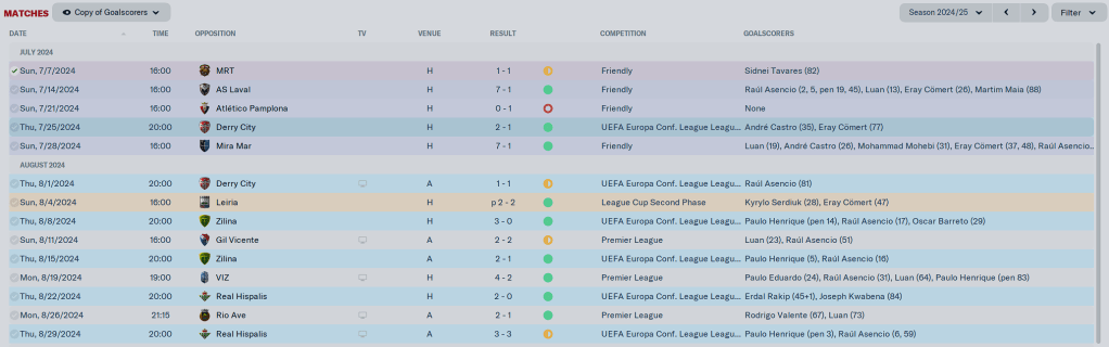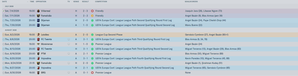 Preseason started the 1st of July. European Qualification started the 23rd of July, when the squad was still in flux, I was making moves while trying to prepare the squad for the possibility of playing a lot of games at the beginning of the season. My fears were realized when we played 11 (!) games from the 23rd of July to the 30th of August across all competitions. My expectations were exceeded when we won 10 of those games: