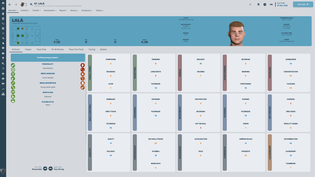 Pedro Bicalho has the making to become the next Anderson Carvalho, at 21 y/o the 3 star current, 4 1/’2 star potential player has the potential to become a very good CM. Currently on loan from Palmerias (I wonder if he could get me Endrick’s signature) he might be out of our price range in the transfer window, but I am going to do what I can to get him back on loan next season.