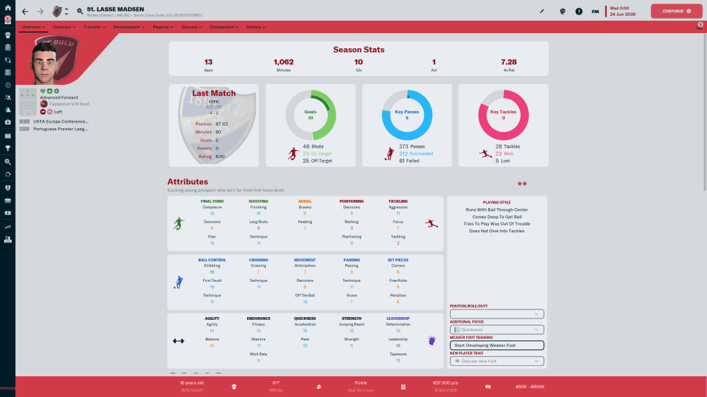 The same issues I was having in my midfield also happened at the AM position, and Đorđe Petrović came in on loan to help provide some cover. A very good youth player, the Serbian had several flashes of potential, but his clause was too much for us to pick him up at the end of the season. He strikes me as one of those players who is going to have a very long and respectful career.