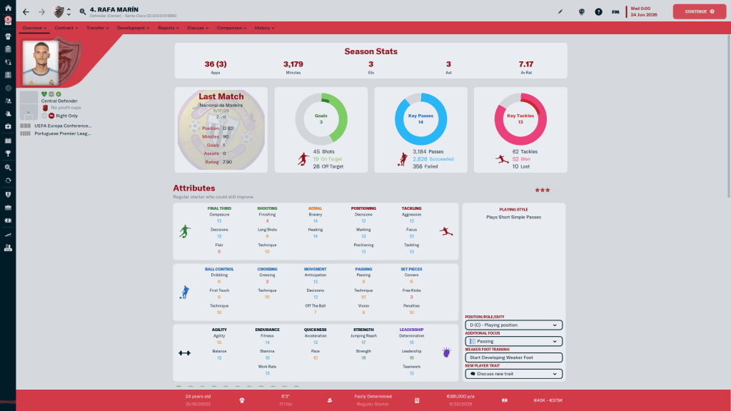 Tomás Domingos can play wingback, but he’d prefer to play in his natural fullback position. At 3 star Current, 4 star potential the 23 y/o is the best defender we have from a technical point of view, and probably from a mental point of view as well. He’s one of the best crossers on the team, so chances are likely he and Calila will split starting duties for the rest of the season.