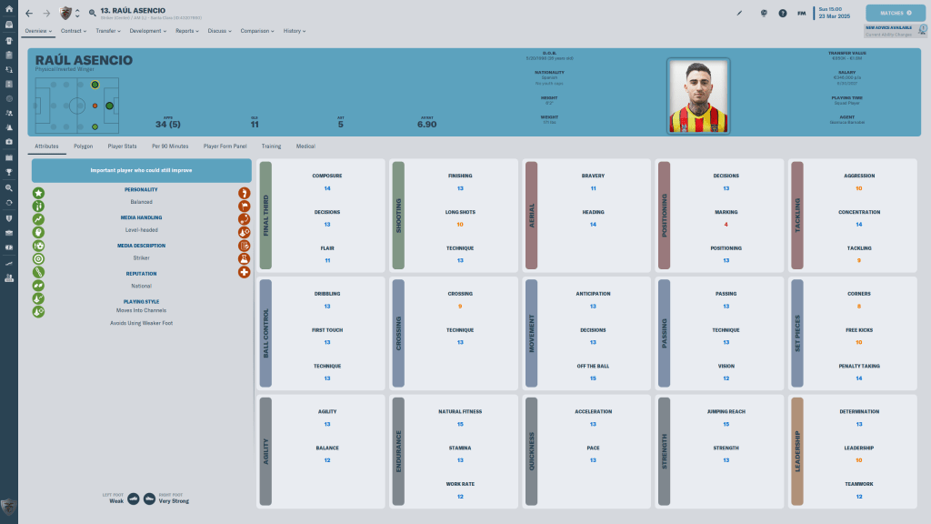 Allano is a solid player, the 27 y/o 3 1/2 current and potential Inverted Winger can also play the left side. He is one of those players who does not excel in any area in particular, but is very solid in those attributes that are best for his position.