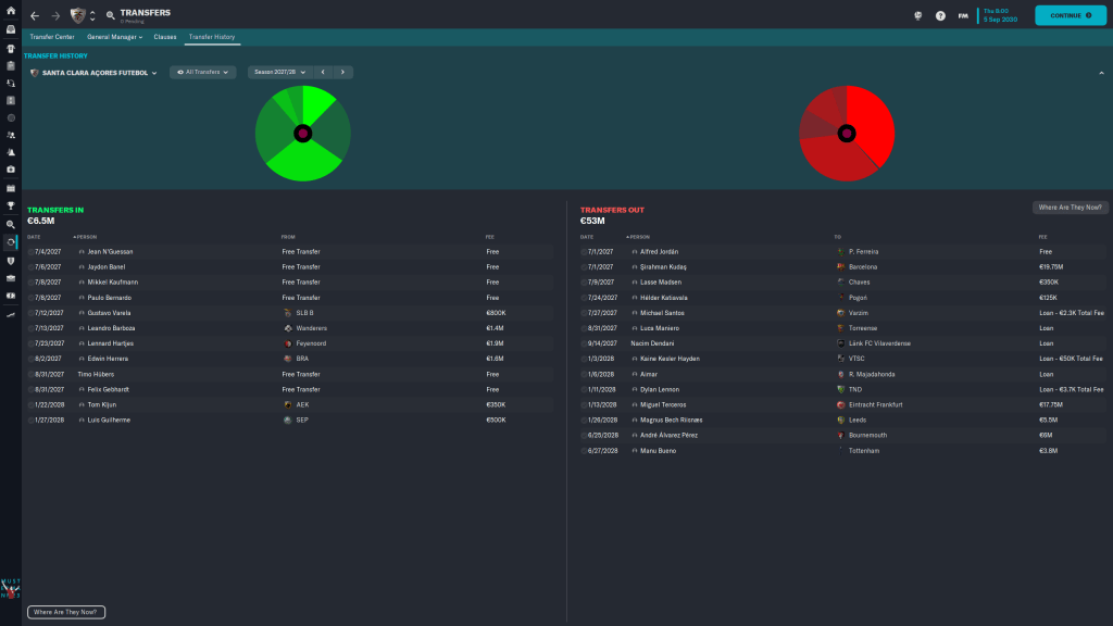 This season, Benfica, brought in €151M in players, Verratti for €18.25M, Davinson Sanchez foe €21.5M, Jonathon David for €48.5M, and Manor Solomon for €50M. And to facilitate that they sold €247M of players. Meanwhile my budget was at about 6M, so yeah…it could be a problem. And it was, as Benfica thrashed us 7-2. The rest of the beginning of the season went as expected, although Sporting needed and 86th minute goal to win, only losing by 1 to them is an accomplishment, if only a small one.