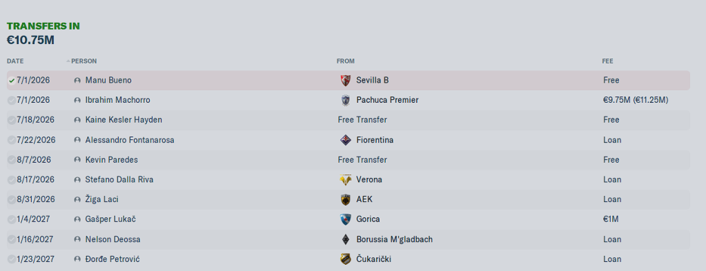 This window went like most of my transfers window do: According to plan, until the bottom drops out and you are scrambling. The first unexpected out was Joaquin Jara. The M(C)/DM had a solid season with us last year, but Eupen cam calling and he really wanted to leave, so I let him leave. Kılıç Arslan Kuruçelik leaving was unexpected to say the least. One of the two Turkish youngsters I picked up on a free after Trabzonspor let both go, I was expecting him to get a lot of first team playing time. With us, and not AS Roma. But the Serie A Italian club came calling, and out the door he went, because I didn’t have a minimum release fee on him.