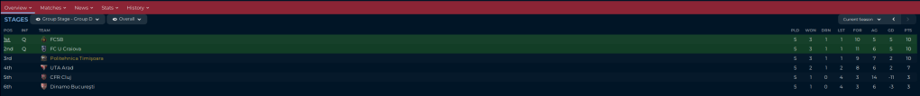 September was great. We had a long break, came back primed and rested for a busy October, 8 games in 24 days sort of busy, and promptly crapped the bed. The good news was that two of the three teams in our Cupa României group games were lower Liga, so I was able to play mostly rotated sides, but at the end of the day, the 3-0 loss to Argeş left us 3rd in the Group, tied with them on 10 points, and they not only had the goal differential but the head to head.