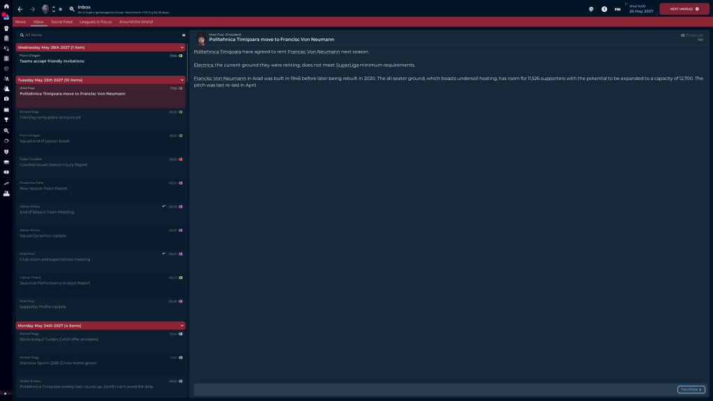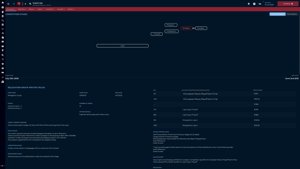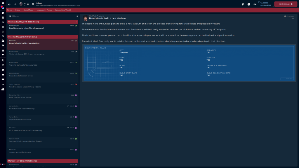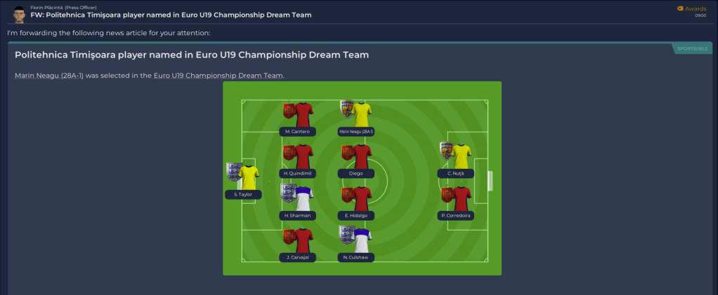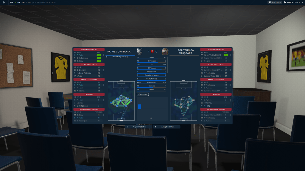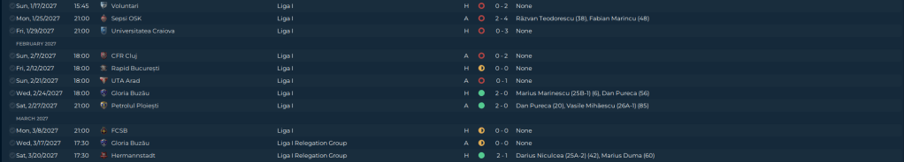 The 4-0 against FSCB was nice, and I was happy with the draw against Cluj until for some inexplicable reason one of their defenders fouled us in the box on a corner kick, and Matiş tucked it away for the last gasp win. The loss against Gloria Buzău was frustrating for several reasons. One is that my guys assumed that because they are recently promoted and are the other relegation pick, they are a bad team, and as a result put in a halfassed effort, the teams average rating without Murariu’s 7.2 is a 6.2. The secondis that they assumed they could turn it on when they needed to, and when they did Gloria Buzău counterattacked and scored their second goal, and would have had a 3rd if not for a brilliant save by our keeper. Losing at Farul Constanţa is not a bad thing, truth be told they are the team we could be if we were also able to do transfers, but as it stands they are about 5 years ahead of us in terms of Youth development, but we will get there. Eventually.