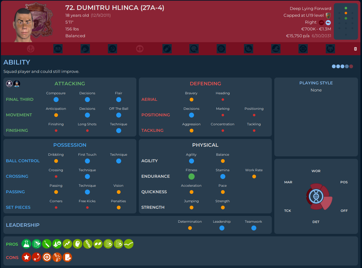 I think whatever hopes I put in Alex Tănase, he will fall short of them. I am pretty sure that all of his attributes are on the lower end of the scale and he lost a star from when he came in to when we signed him. His versatility might save him, his injury proneness and horrible Possession attributes probably won’t.