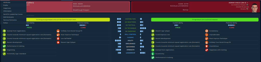 For some reason, Rotariu has never grown above two stars. There could be reasons for that, the best is that as the club has gotten better, so has he, but as star rating are based on the players at your club, he’s grown with the rest of the squad but not gotten better. He started 15 games for us, and ended up with a 7.21 rating. The good news is we didn’t hear a lot about him doing bad things. The Bad news is we heard nothing about him doing good things. Alexandru went on loan to a Liga II Club, started 18 games and allowed 18 goals, and the club he went to was relegated…Sandru and Vasiliu are the same age, and while on paper Sandru is the better keeper now, I think Vasiliu will be the better overall keeper, which is why I gave him starts this season. Next season the job is his to lose.