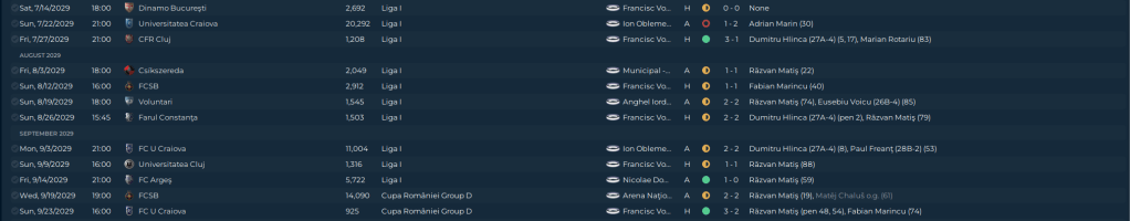 There’s no middle ground. We’re either losing close, usually, or winning. The lack of draws is concerning. The low point was losing to a Liga II side in Hermannstadt in the Cupa României First Stage on penalties. Răzvan Matiş missed a PK in the 20th minute, then scored in the 117th to put as ahead, but the defense fell apart and they scored in the 120th…and then three of my guys missed their PK’s.