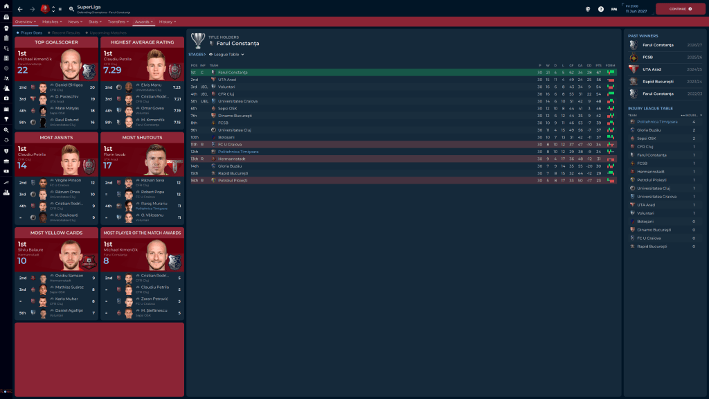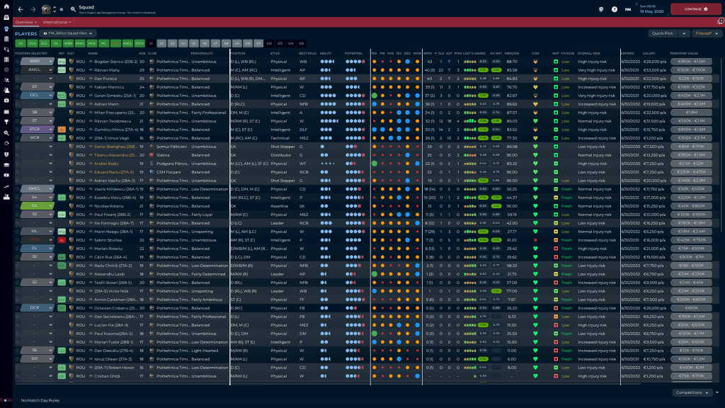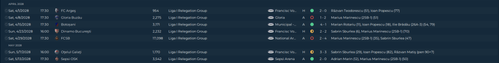 51 goals from our top 4 attacking players is very nice, Matiş and Teodorescu also chipping in with 20 total assists is also very good. Dan Pureca, starting at WB(R) most of the season, made the most of his skills by chipping in 10 assists as well. Of the squad we inherited when we took over, only a few are left. Marincu, Pureca, Matiş and Murariu are the last, and Murariu is probably going to be leaving soon. Luckily we have several good candidates to replace him.