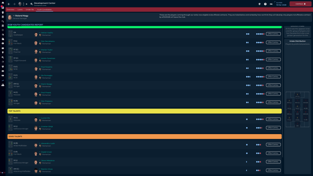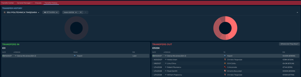 One of the thoughts lingering in the back of my mind since the start of the save is “What if we become to successful to soon?” In many saves this isn’t something to worry about, but in a Youth Save (for many teams anyways), it is because if you are at a smaller club, when you get good Youth players who perform very well early in their careers, teams with more, be it reputation, money, and the like, will come calling for them. And they will leave, because despite the fact you are a brilliant Head Coach, the clubs has good facilities, good finances, and a growing reputation, you do not have the name, brand, continental or worldwide recognition and reputation to keep those players local. Case in point: Darius Niculcea. Perhaps the best player from the ’25 Youth Intake, he was forced into the starting XI for a variety of reasons, and he performed very well. So well that Napoli came and offered us €500K. And since he’s left, he sat on the bench for a year, and then went on loan for half a season to Bari, where he was OK. Would he have been better of staying here for another year or two? Maybe.