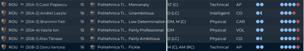 Of Eusebiou Iacob, Victor Niţă, Lennart Meyer and Robert Hexan, I think the one who doesn’t belong is Meyer. Yes, his starting attributes are nice, but he came in at 4 stars and is now a 3-4 star sort of player. The fact the has has a Balanced personality is more than a little salt in the wound, because I think what we see with him currently is what we are going to get. On the other hand, Robert Hexan is one player who I think will be better than he appears to be. Yes, the Low Determination is a killer, but his Physical and Defending Attributes are quite solid, and he’s also solid with regards to his Composure, Decision Making, Anticipation and Technique, plus he has the one thing you cannot teach: Height. at 6′ 4″ and 165 pound already, he’ll be on the bench at 17 getting some first team playing time. Maybe we can play him into a better personality.