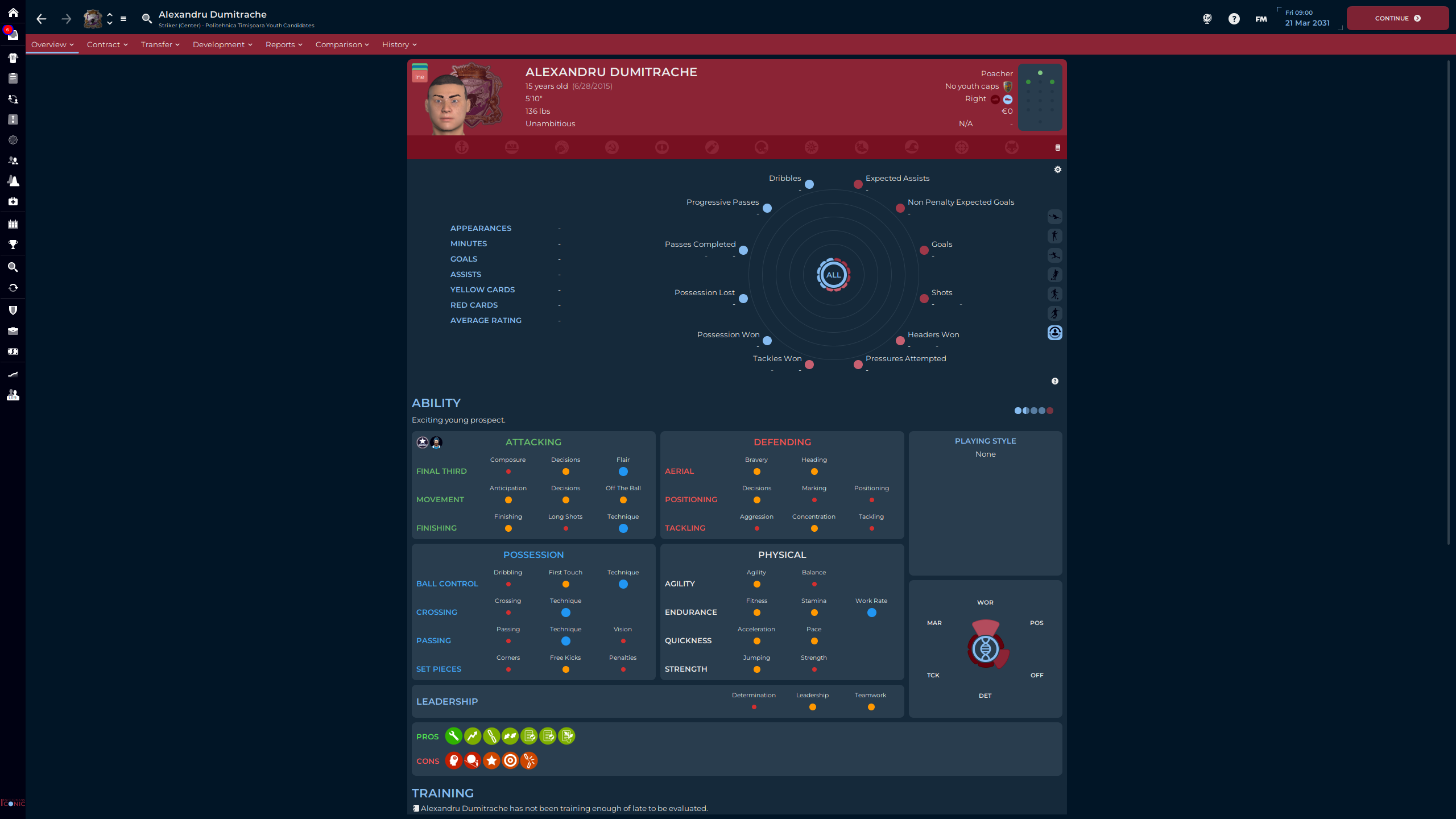 I can’t put my finger on it exactly, but Ilie Brădău bothers me. It’s not that he’s already pretty decent Physically speaking, or that the rest of his attributes really aren’t all that bad considering his a 15 y/o kid at a club with better than decent facilities but only OK coaching, in a country that’s also just OK at producing ‘Good to Great’ talent. He has the potential, heck they all do, but something tell me that in every Youth Intake there’s one player who will look like Tarzan, and play like Jane, and I think he may be the one, I don’t know why though