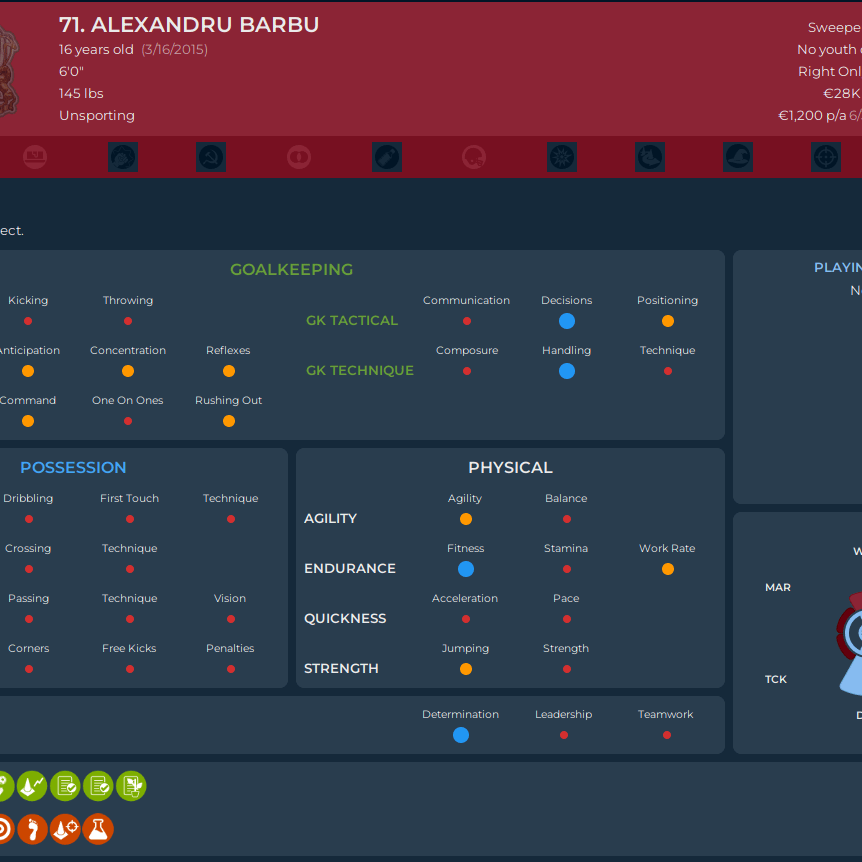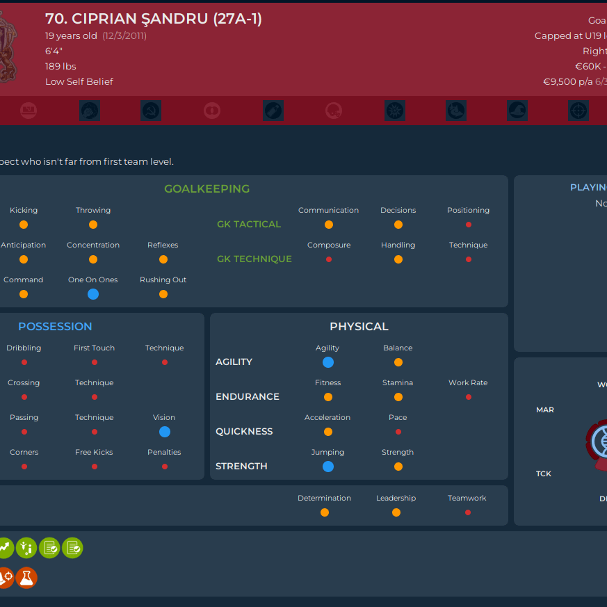 If he improves his Stamina, Strength, Concentration and Positioning, I think Oltean could have a long term future at the club, despite the Injury issues. What I am hoping is that he’s not another one of those players who comes in with their CA at 70, and their PA is 85. Another one to keep a closer eye on.
