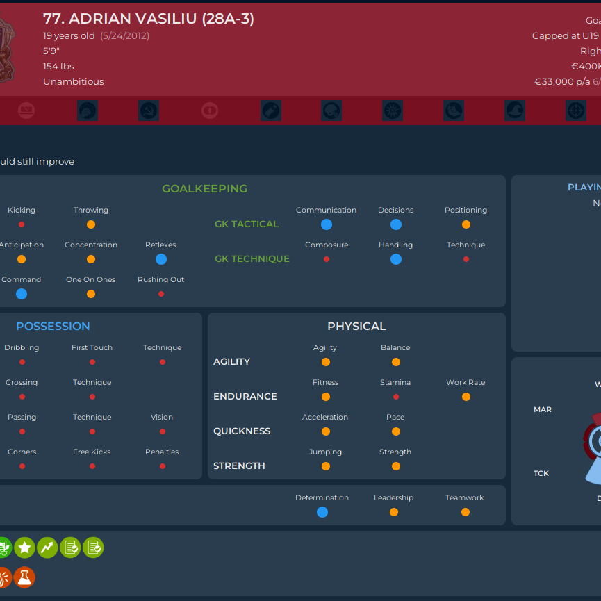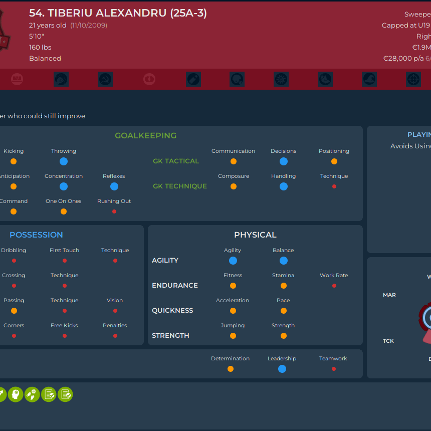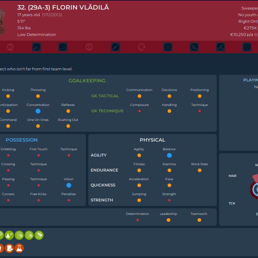 If Florin Ilie can overcome his personality traits, I think he can be quite good for this level of Football. Physically speaking, he is quite solid, yes his strength is low but that will come up as he gets older (hopefully). And while 5′ 11″ is by no means short, for a D(C) it is on the small end, which is probably why his Aggression and Bravery are both high. He’s lacking where you would expect all young D(C)’s to lack, Possession attributes, and Finishing Attributes. He will most likely be a started in a few seasons.