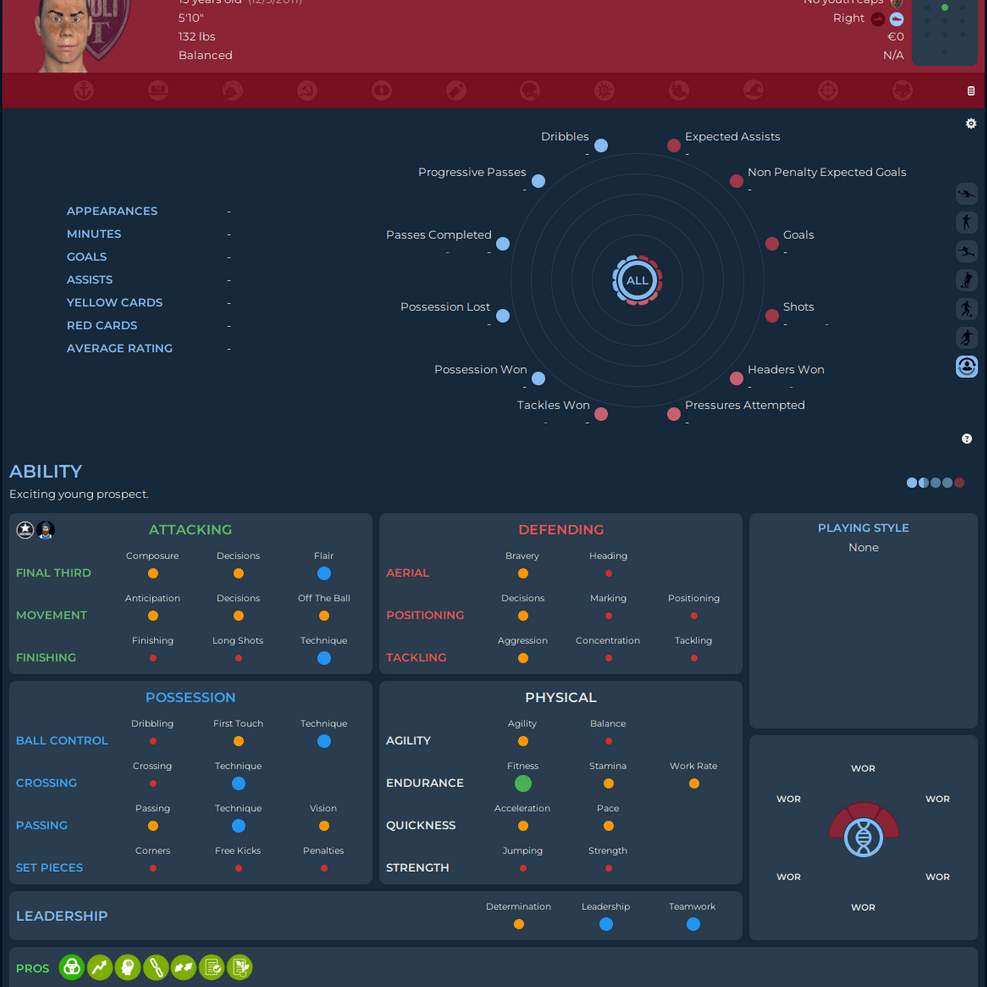 His Bravery is the standout attribute, but his Aggression, Tackling, Fitness and Work Rate are nothing the laugh at either. I suspect a lot of his “Average” scores are in the 9-10 range, and if he doesn’t meet his 4 1/2 star potential, he should still become a very solid midfielder.
