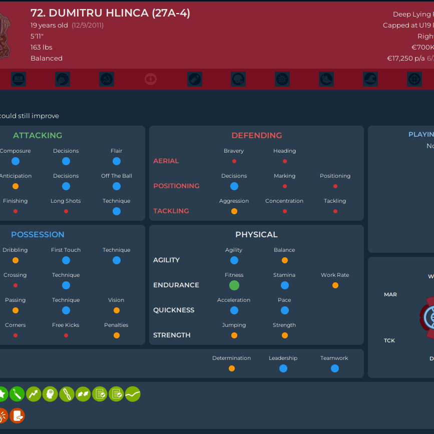 His Attacking and Possession attributes are already on the right side og good for the most part, if his defensive skills pick up, to where he is merely ‘Average’ as opposed to ‘Bad’, I think he’ll be a great DLP. As it stands, he has a couple of other players ahead of him on the depth chart, but they bring more issues to the table than Olteanu does. And having to many good players for a position is a problem I think a lot of FM managers would love to have.